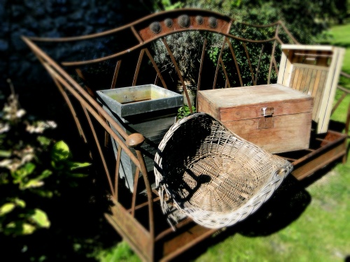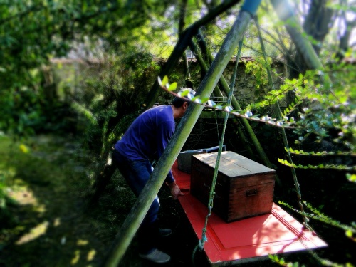 The loading or unloading of various wooden or metal containers in a wooden cart.